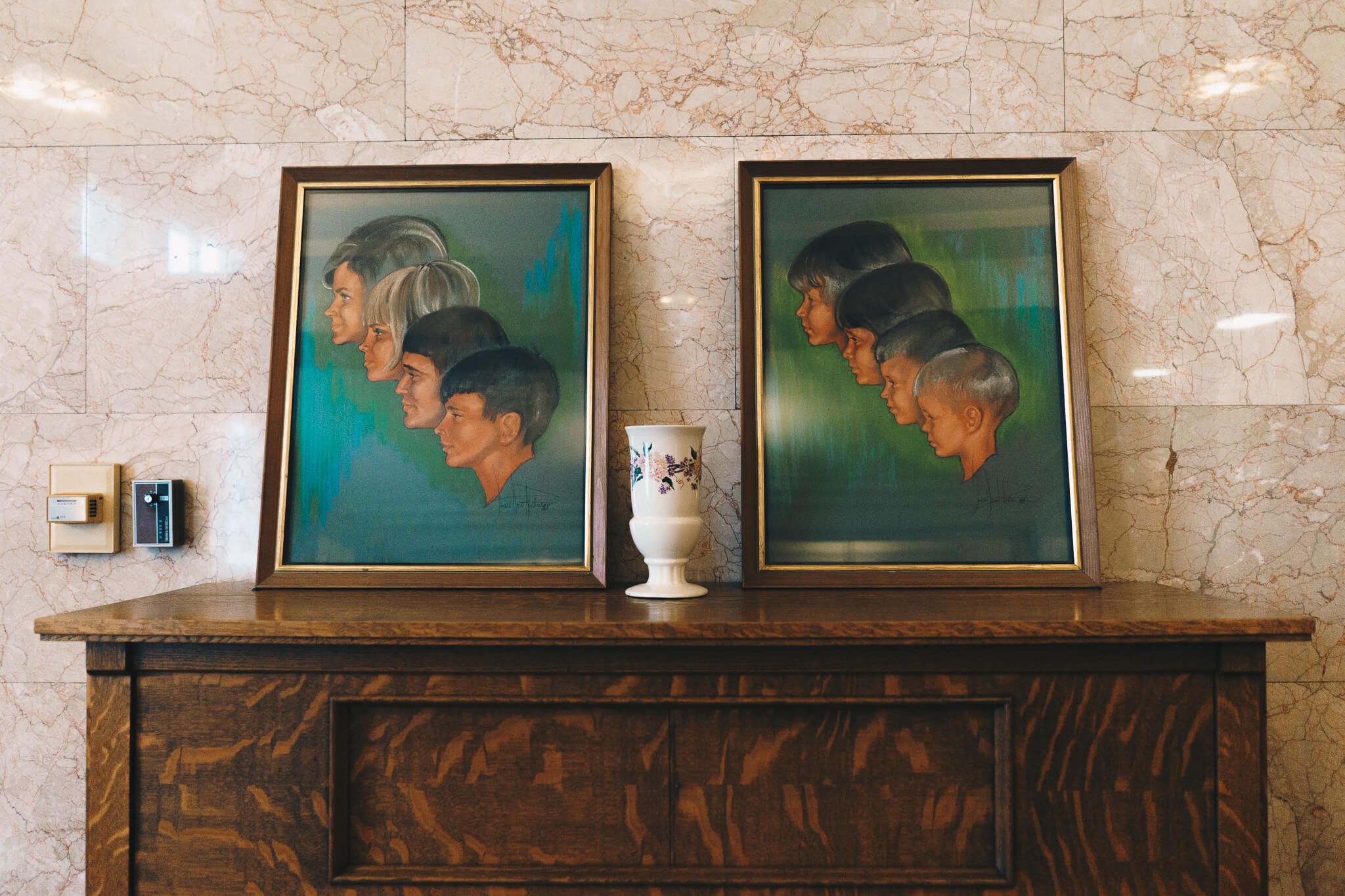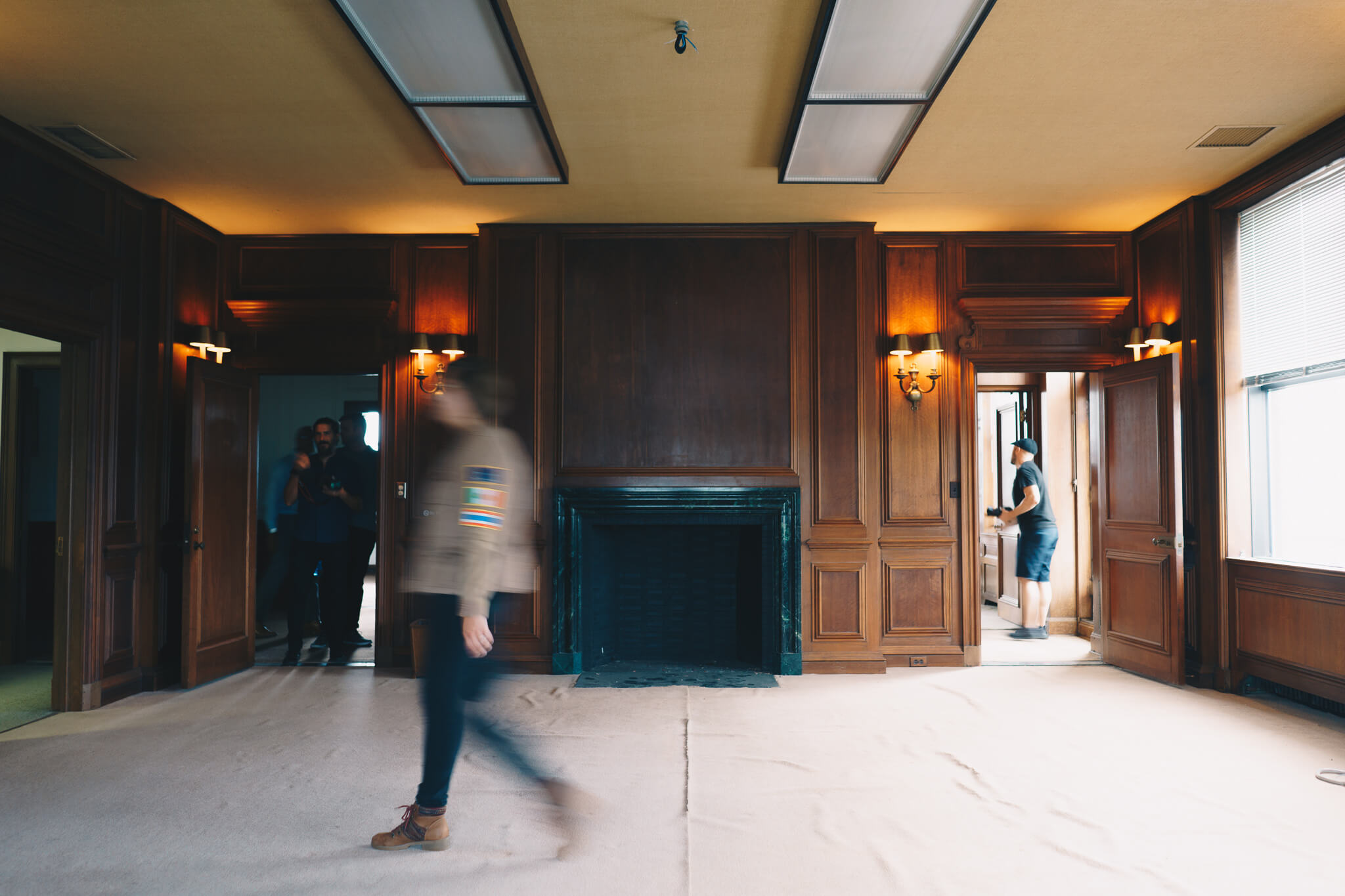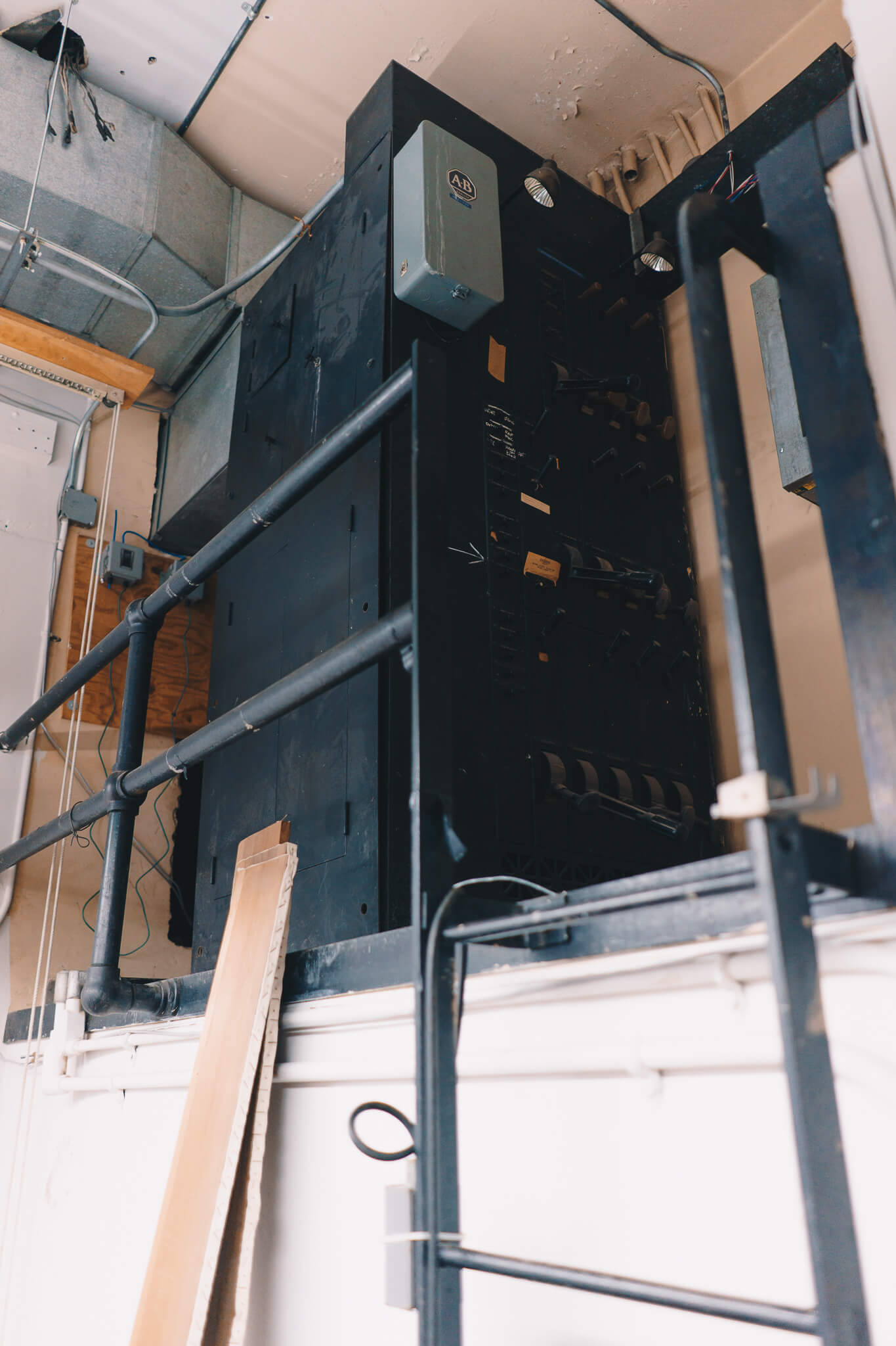 Once on the second floor, we walked past ornate water fountains to what was originally a theater, both for performances and motion pictures at different stages of life. A now walled-in stage, back room mechanicals, rectangular openings for projectors, and striking ceiling all point back to this original purpose:
