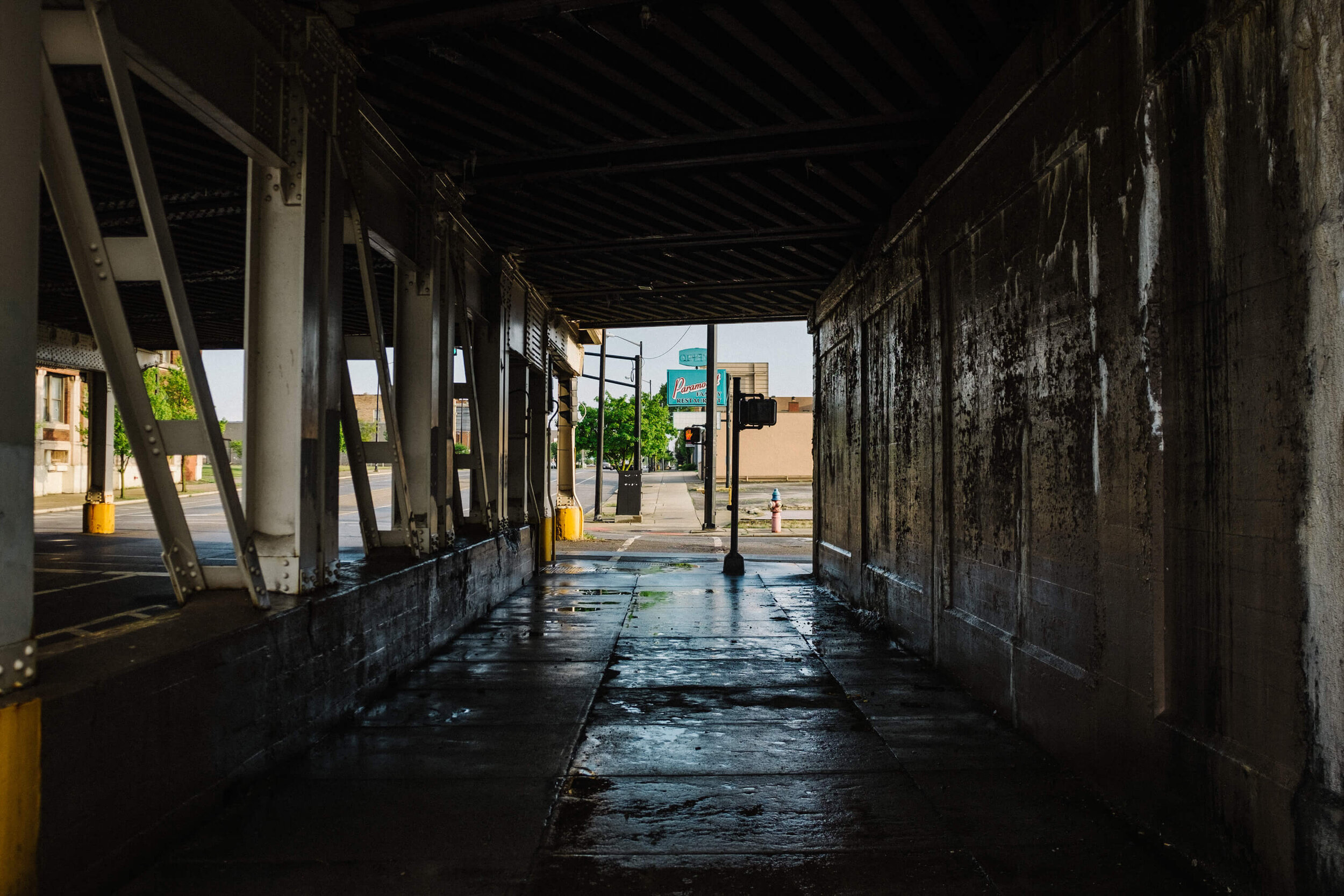 I make my way under the West Bronson Street Bridge and love the contrast of light and shadows with the reflection of fresh rain on the sidewalk.