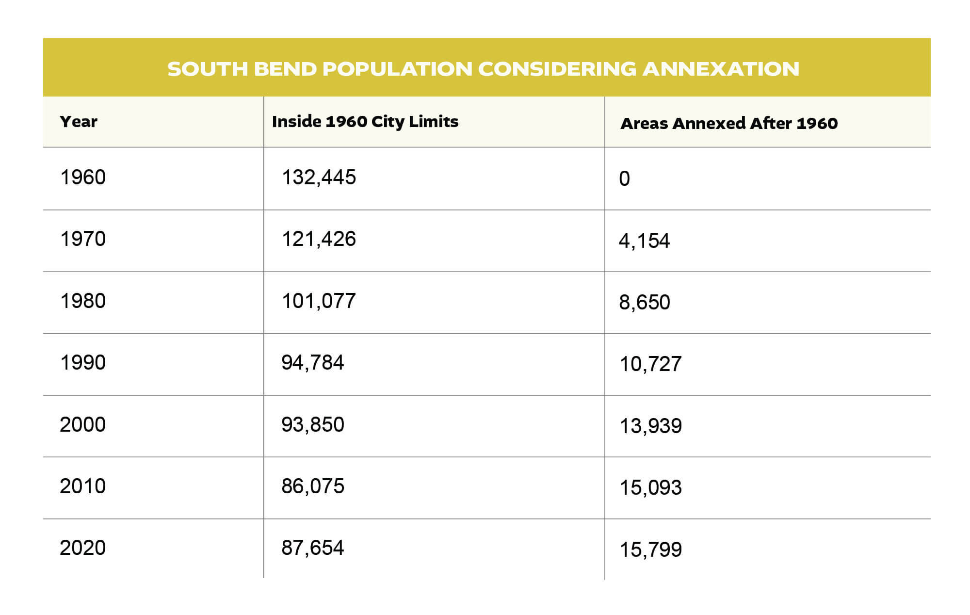 For six straight decades, the area inside the 1960 city limits continued to hemorrhage people while annexations elsewhere were not enough to make up for that decline. The 2020 Census found that South Bend grew both inside and outside of the 1960 city limits.