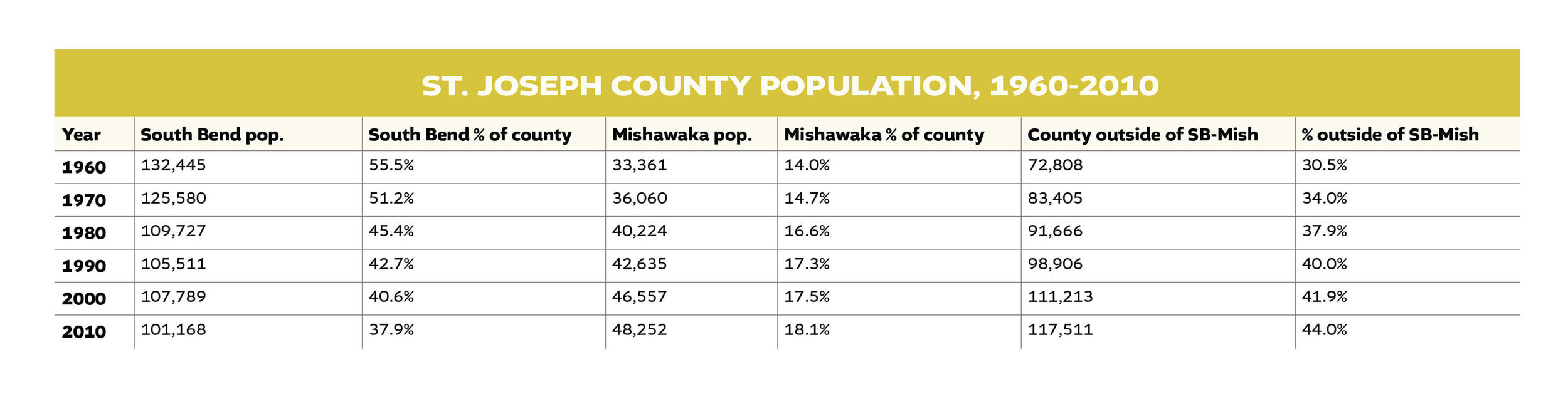 As previously discussed, while South Bend began its half-century long population decline, the entirety of St. Joseph County continued to gain residents. South Bend’s decline was not the result of the region losing people, but specific movement of populations within the region. Most of this growth happened in unincorporated St. Joseph County. The growth of a metro area while its primary city stagnates or declines is an unprecedented outcome now taken for granted.