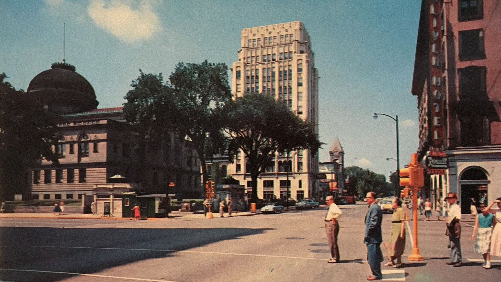 Looking West on the corner of Main and Washington Streets in downtown South Bend, Indiana.